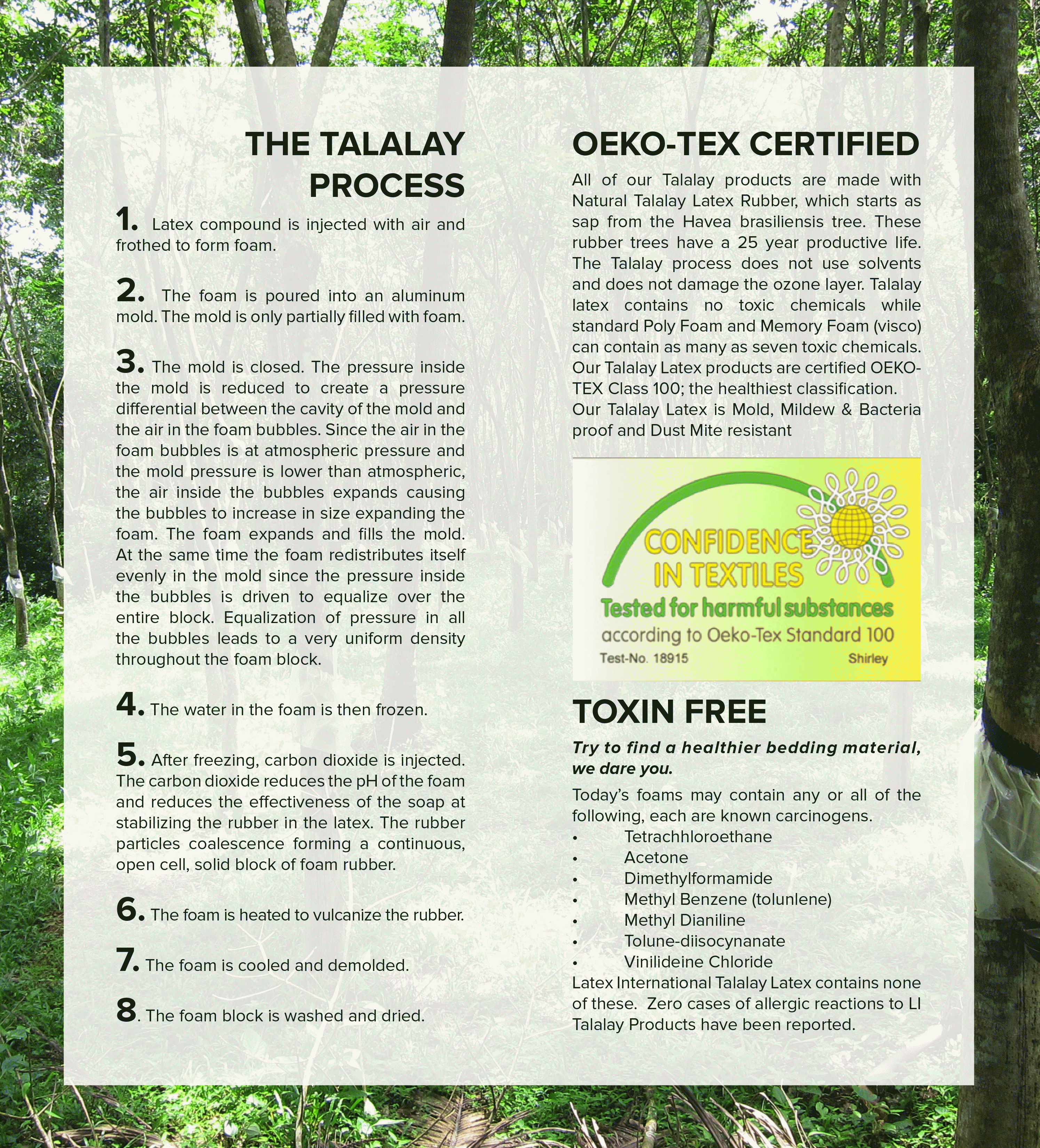 | Global Organic Latex Standards. No fertilizers or pesticides. Most mattresses today have 100% synthetic material inside. | Global Organic Textile Standards. Organic Cotton and Wool. Most mattresses today use 100% synthetic materials for quilting. | The Dunlop Process that comes with a certification that no pesticides or fertilizers are used in the making of the Latex. |